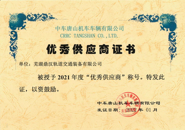 近日,鼎漢技術全資子公司蕪湖鼎漢軌道交通裝備有限公司被中車唐山機車車輛有限公司授予2021年度“優(yōu)秀供應商”稱號。該榮譽的獲得體現了蕪湖鼎漢優(yōu)質的產品、卓越的服務得到了客戶的高度認可。