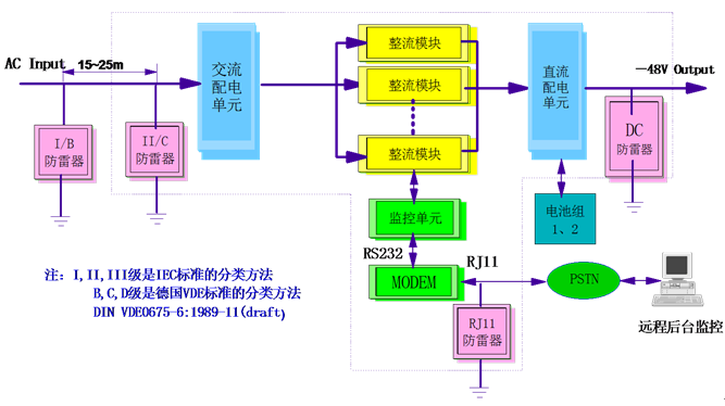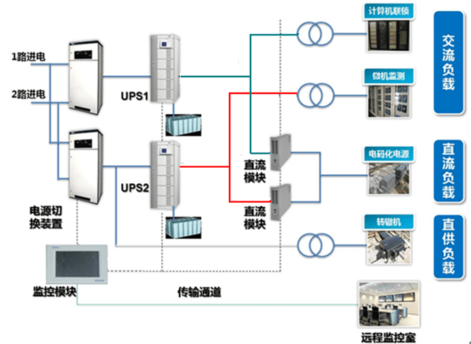 The two lines AC power supply is provided by power supply specialty; the power distribution cabinet directly distributes the AC power supply to the AC load and provides the high-frequency switch power supply with one line AC power supply; the high-frequency switch power supply allocates a battery pack with a certain capacity according to the requirements of the DC load backup time.