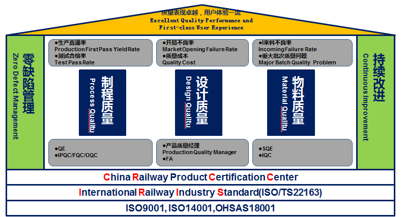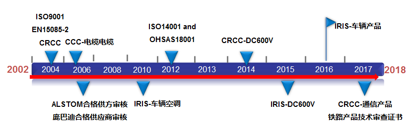 --公司通過了ISO9001質量管理體系、ISO14001環(huán)境管理體系、ISO45001職業(yè)健康管理體系認證,同時通過了國際鐵路行業(yè)質量管理體系ISO/TS 22163(原IRIS)認證以及中鐵檢驗認證中心CRCC認證、EN15085焊接體系認證、泰爾產品認證、CE認證、CQC自愿性產品認證等。